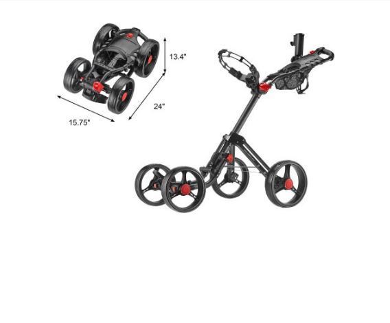 The SuperLite 4-Wheel Explorer Golf Cart weights less than 14 pounds and can be folded in two simple steps to compact size for easy storage in car trunks before or after your round of golf. The 10.5-inch rear and 9.5-inch front wheels make it rolling easily in the high grass. Golfers can push the cart effortlessly on all terrain with the stable four-wheel design, multiple handle positions and smooth-rolling ball-bearing wheels. The CaddyTek Explore is equipped with features that most golfers want, including umbrella holder, scorecard holder with storage compartment, beverage holder and the mesh net basket on the handle. Rain or shine, cart your clubs around the green in style and enjoy the game! Distance of the front wheel can be adjusted between 11.5 inches to 12.5 inches.